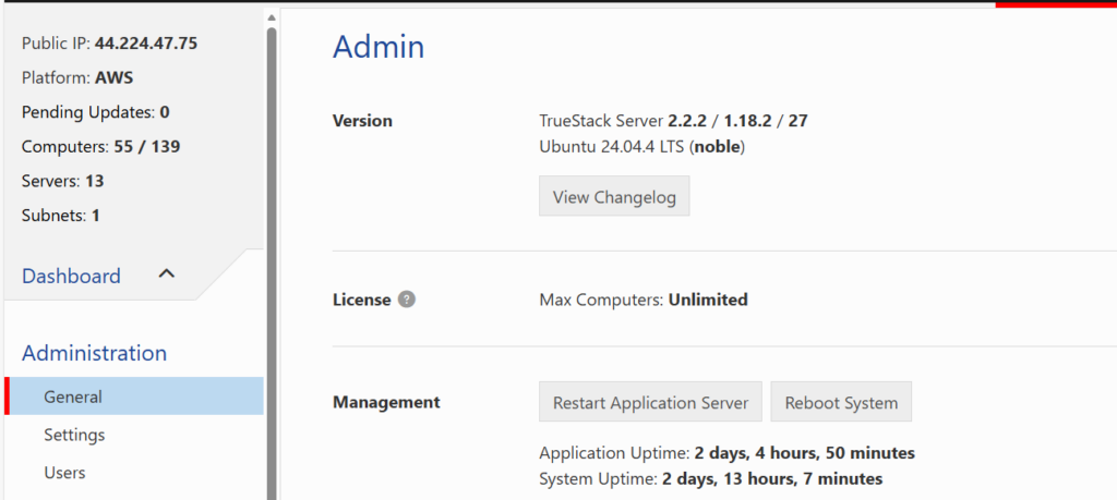 Troubleshoot: If the IP doesn’t redirect wait a few minutes. Your instance may still be starting up. After waiting, if it still doesn’t redirect to your TrueStack web address, reboot the EC2 instance from your AWS EC2 dashboard. A reboot will take about 3 minutes or less.